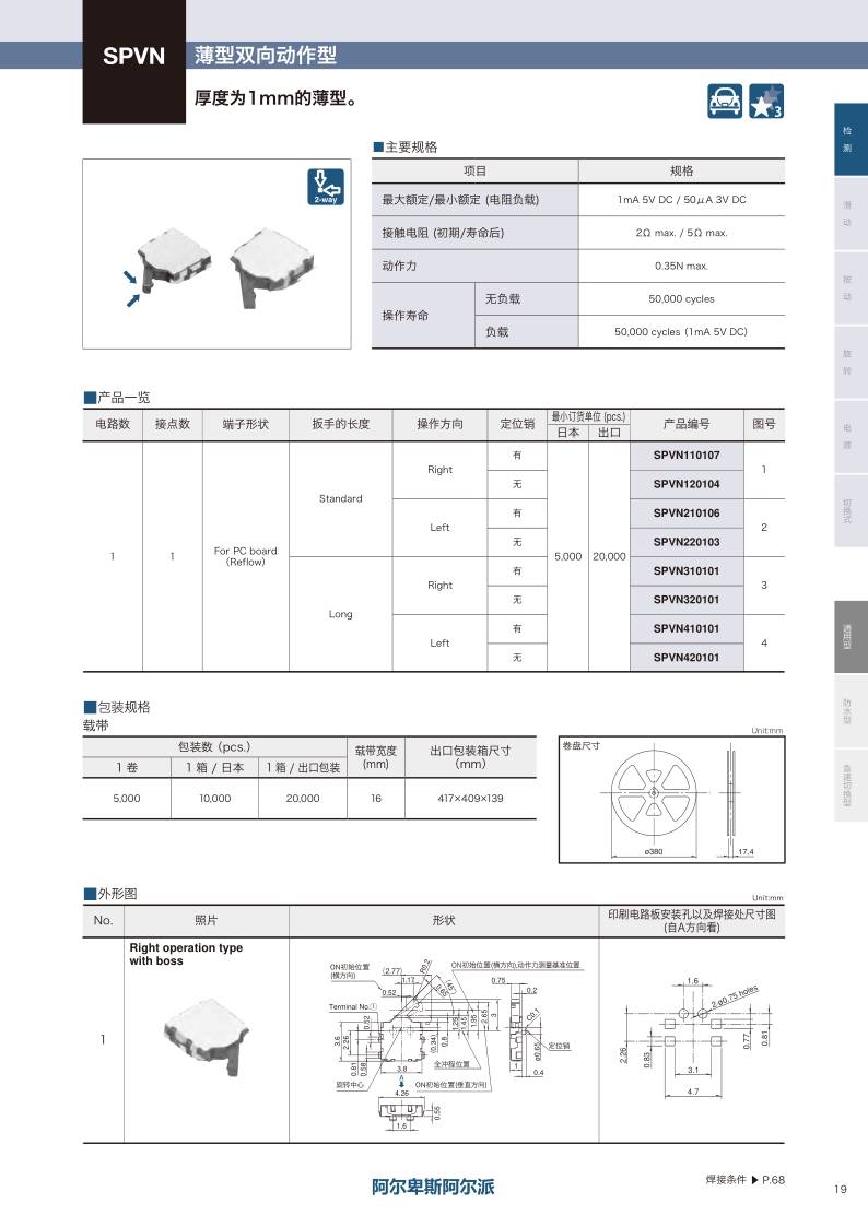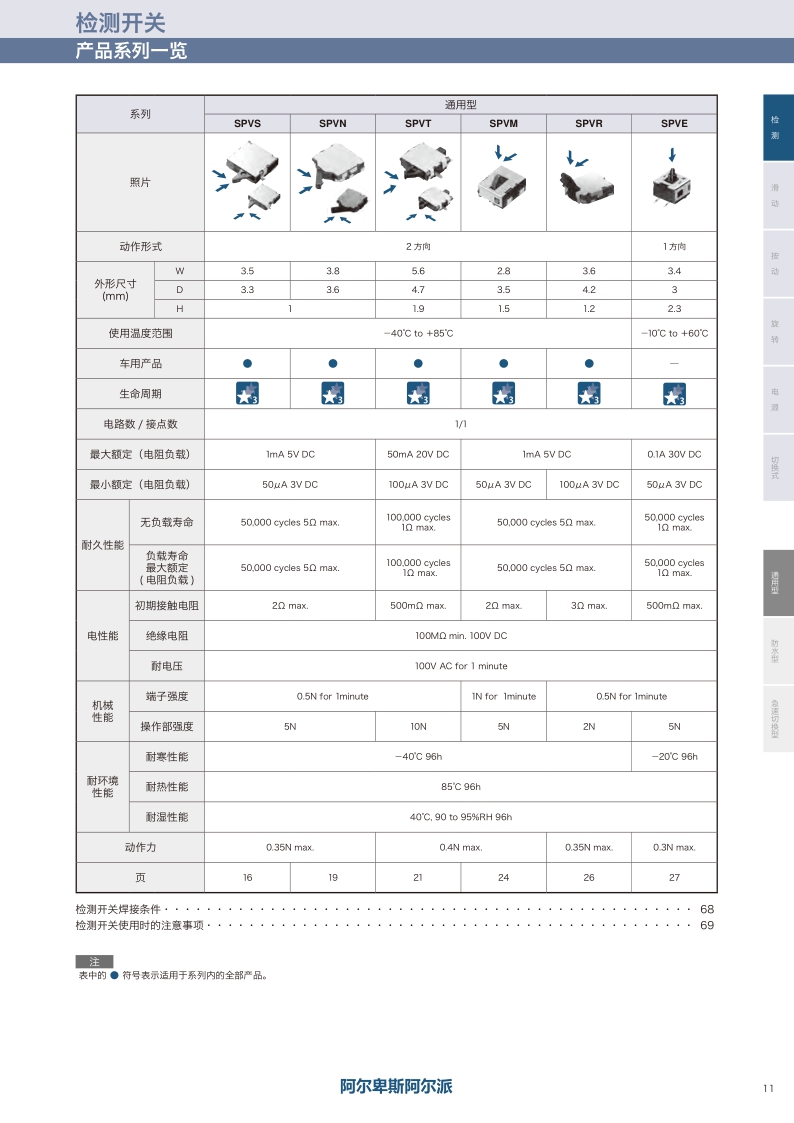 臥式 / 薄型雙向動作型 ? 最大額定值:1mA 5V DC ? 動作力:0.35N max. ? 操作壽命(無負(fù)載):50000 cycles。