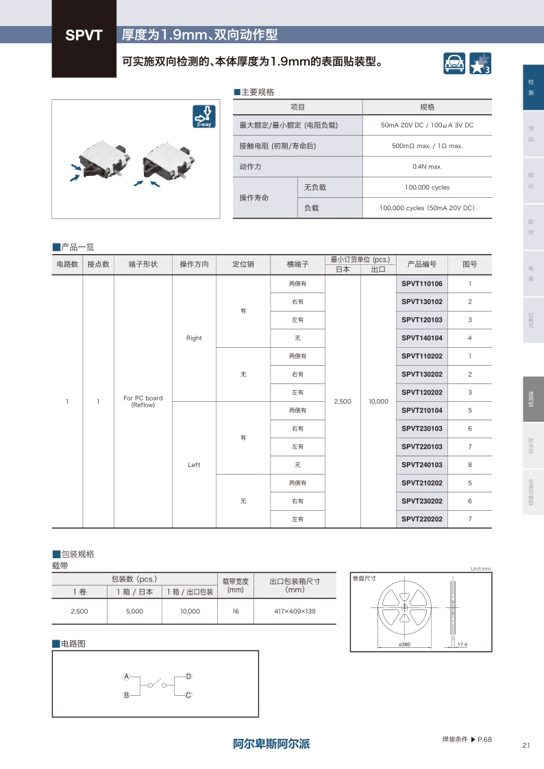 SPVT240103 照片 1 1 For PC board (Reflow) 0.4N max. Left 4.7×5.6×1.9mm