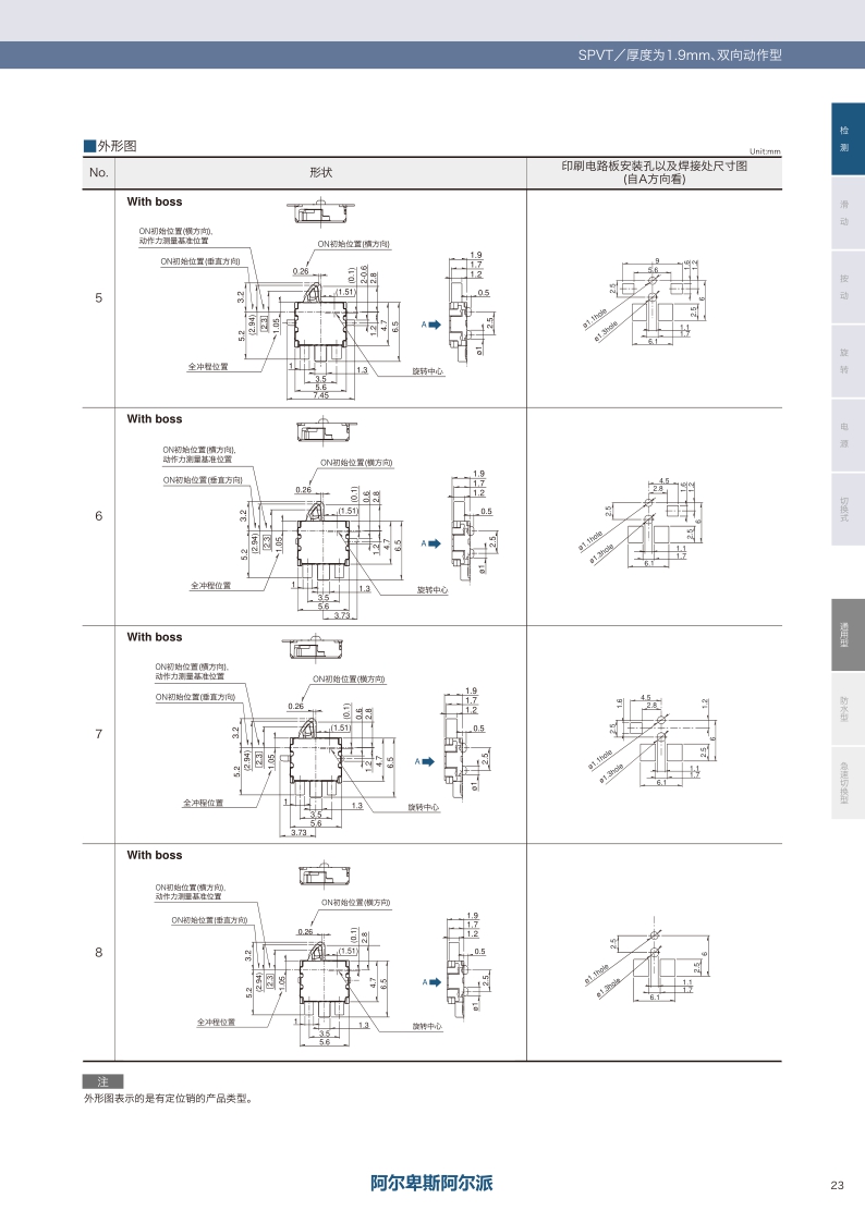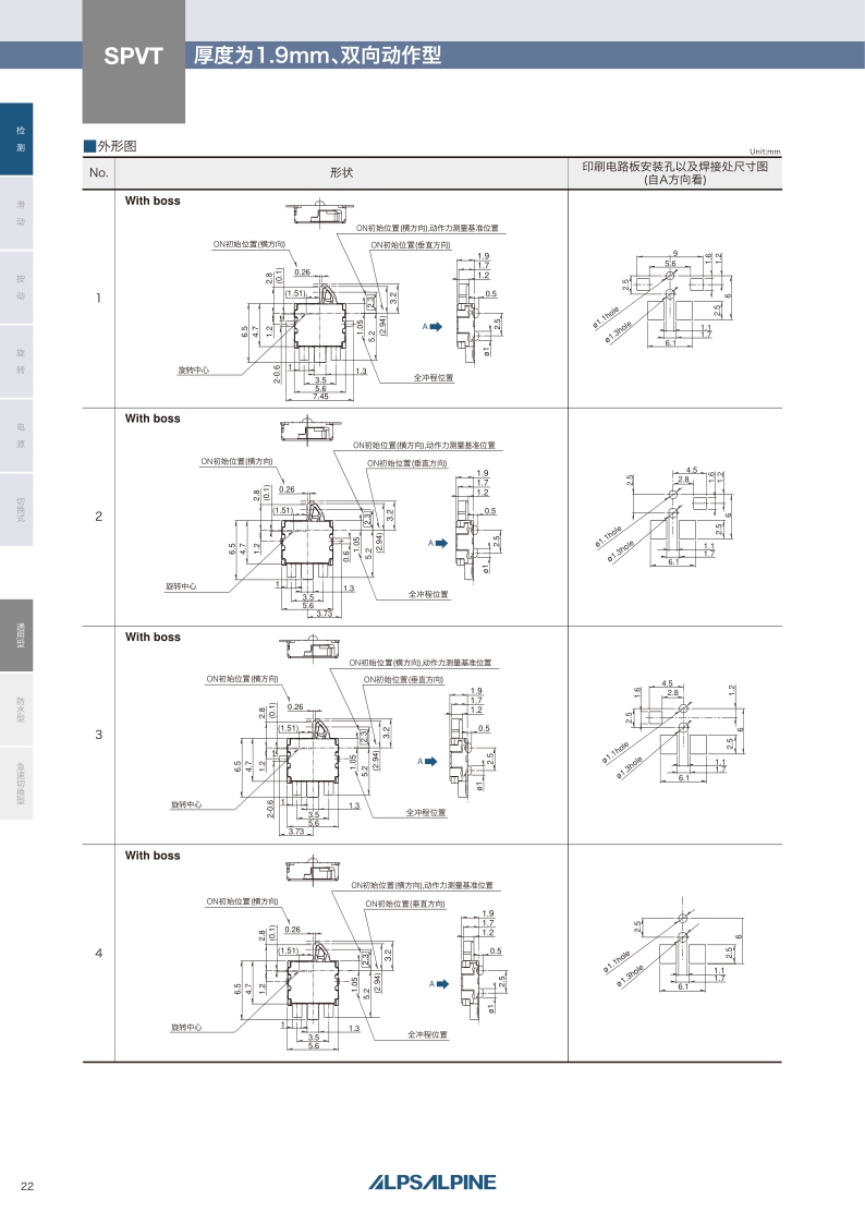 產(chǎn)品編號 照片 電路數(shù) 接點數(shù) 端子形狀 動作力 操作方向 定位銷 橫端子 尺寸(W×D×H)