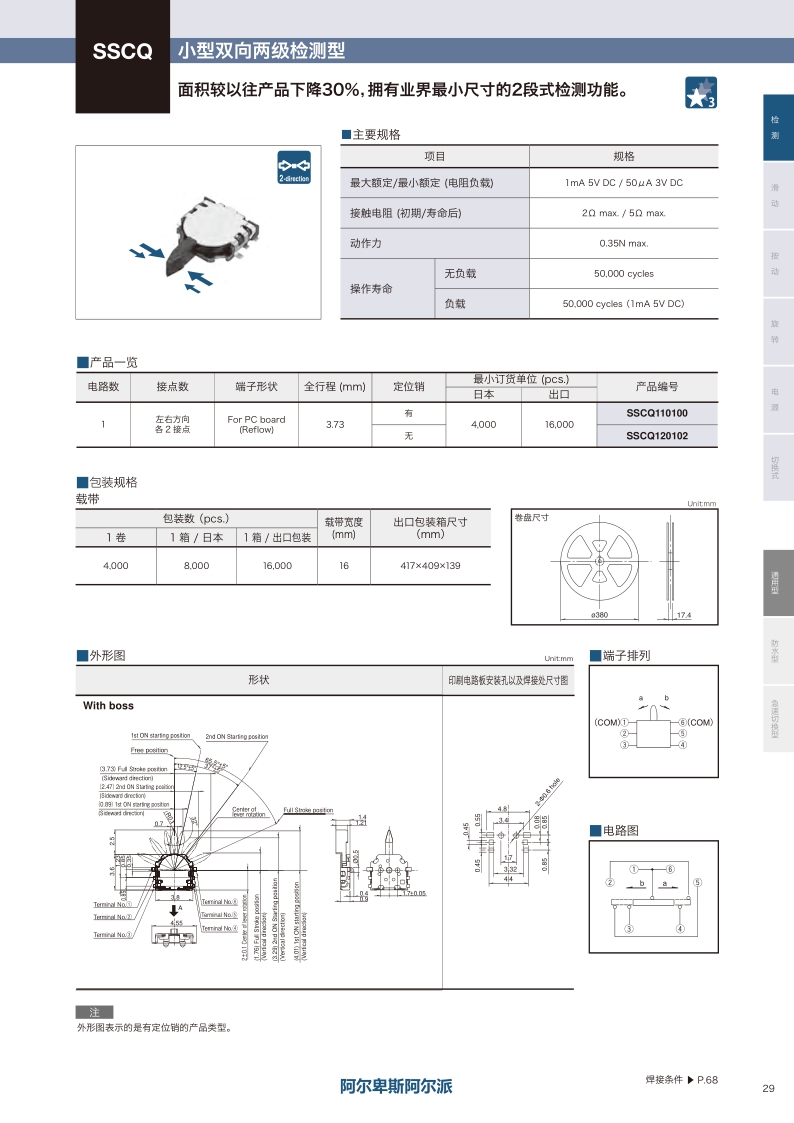 臥式 / 小型雙向兩級檢測型 ? 最大額定值:1mA 5V DC ? 動作力:0.35N max. ? 操作壽命(無負(fù)載):50000 cycles
