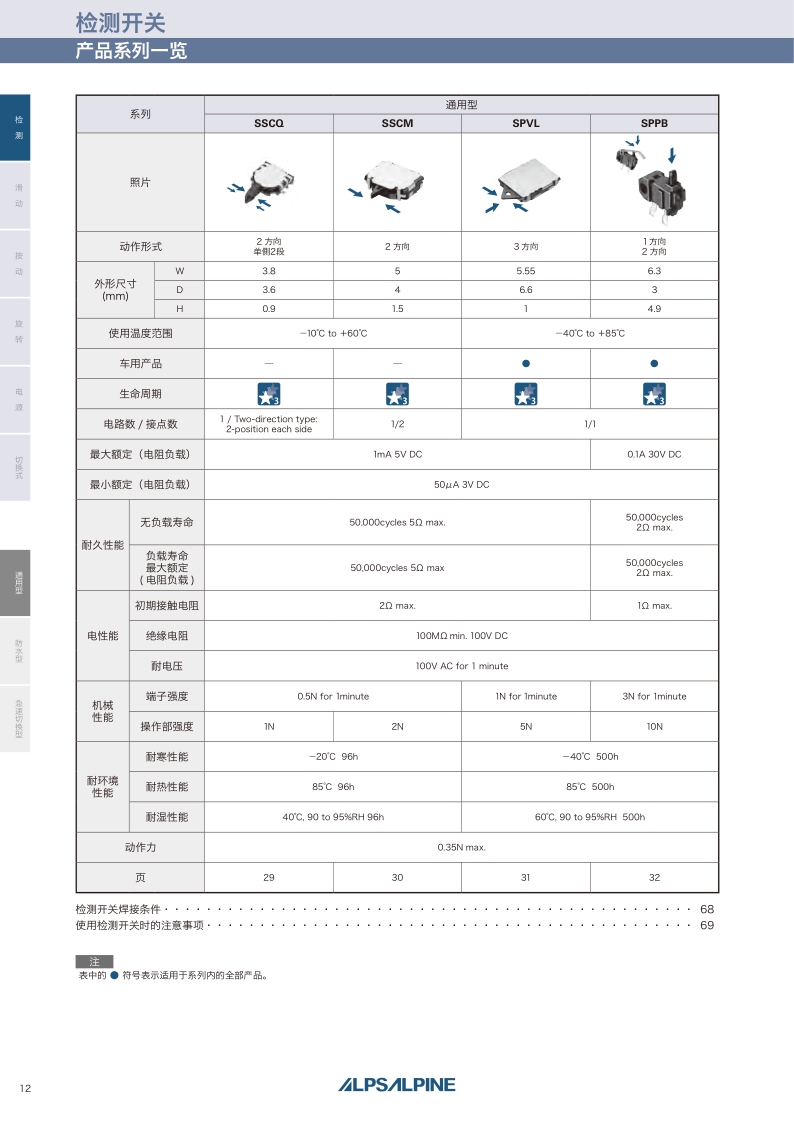 臥式 / 薄型多方向動作型 ? 最大額定值:1mA 5V DC ? 動作力:0.35N max. ? 操作壽命(無負載):50000 cycles。