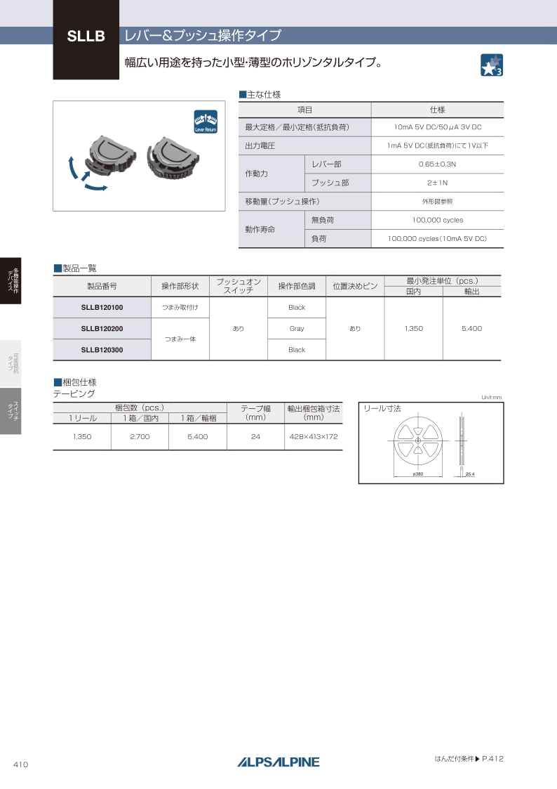 SLLB系列使用范圍廣泛的小型 薄型橫向操作開關(guān)。方向分辨率:2方向 ? 功能:操作桿和按動 ? 尺寸(W×D×H):11.8×11.4×3.0mm ? 最大額定值:10mA 5V DC。
