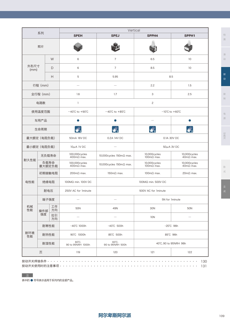 易于使用的中型立式。操作方向:Vertical ? 最大額定值:0.1A 30V DC ? 行程:2.2mm ? 電路數(shù):2-pole。