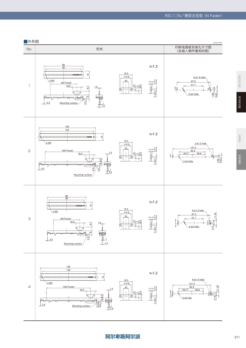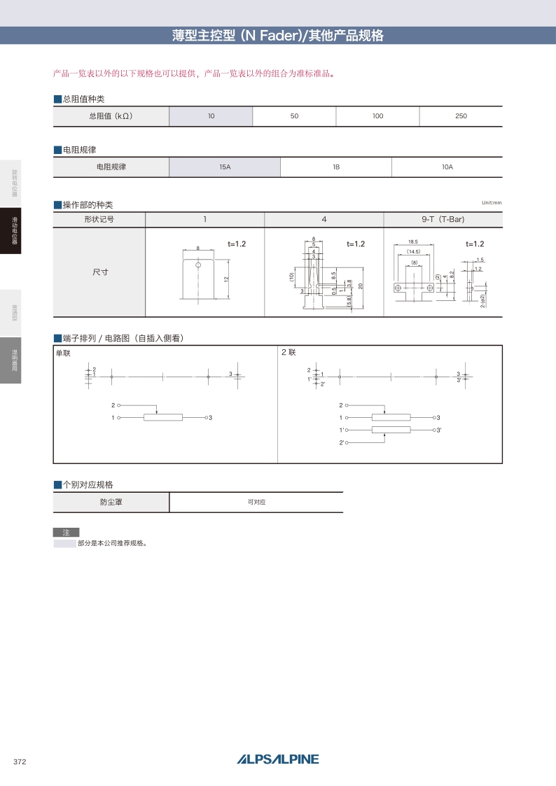 產(chǎn)品編號 照片 電阻體數(shù) 安裝方向 行程 操作部形狀 操作部長度 總阻值 電阻規(guī)律 端子形狀