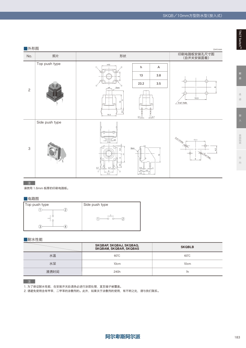 實(shí)現(xiàn)良好的防水·防塵結(jié)構(gòu) 適用于有防水要求家電產(chǎn)品。操作感覺:敏感 ? 貼裝方式:按入 ? 尺寸(W×D×H):Top push: □10.0×5.0/13.0/23.2mm Side push: 11.5×11.9×11.3mm ? 特長:防水及防塵型。