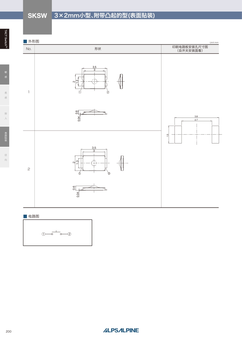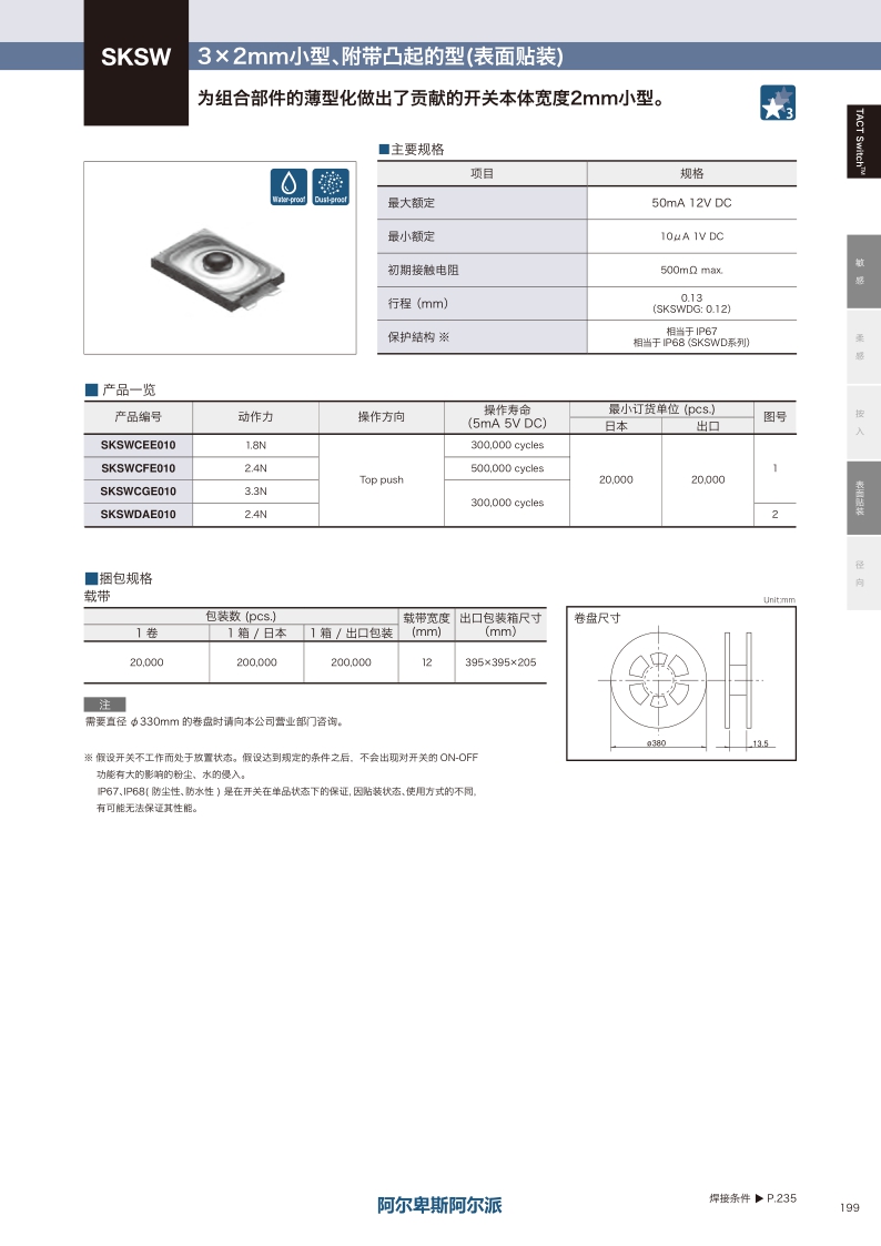 為組合部件的薄型化做出了貢獻的開關本體寬度2mm小型。操作感覺:敏感 ? 貼裝方式:表面貼裝 ? 尺寸(W×D×H):3.0×2.0×0.6mm ? 特長:小型?薄型 防水及防塵型 IP67(部分 IP68)。