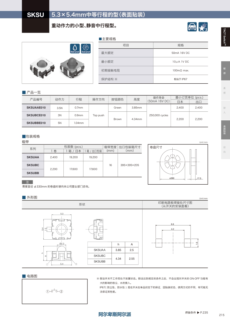 兼顧了較重作動(dòng)手感與靜音的小型化中行程類型。操作感覺(jué):敏感 ? 貼裝方式:表面貼裝 ? 尺寸(W×D×H):5.3×5.4×3.85/4.34mm ? 特長(zhǎng):中行程 防水及防塵型 IP67。