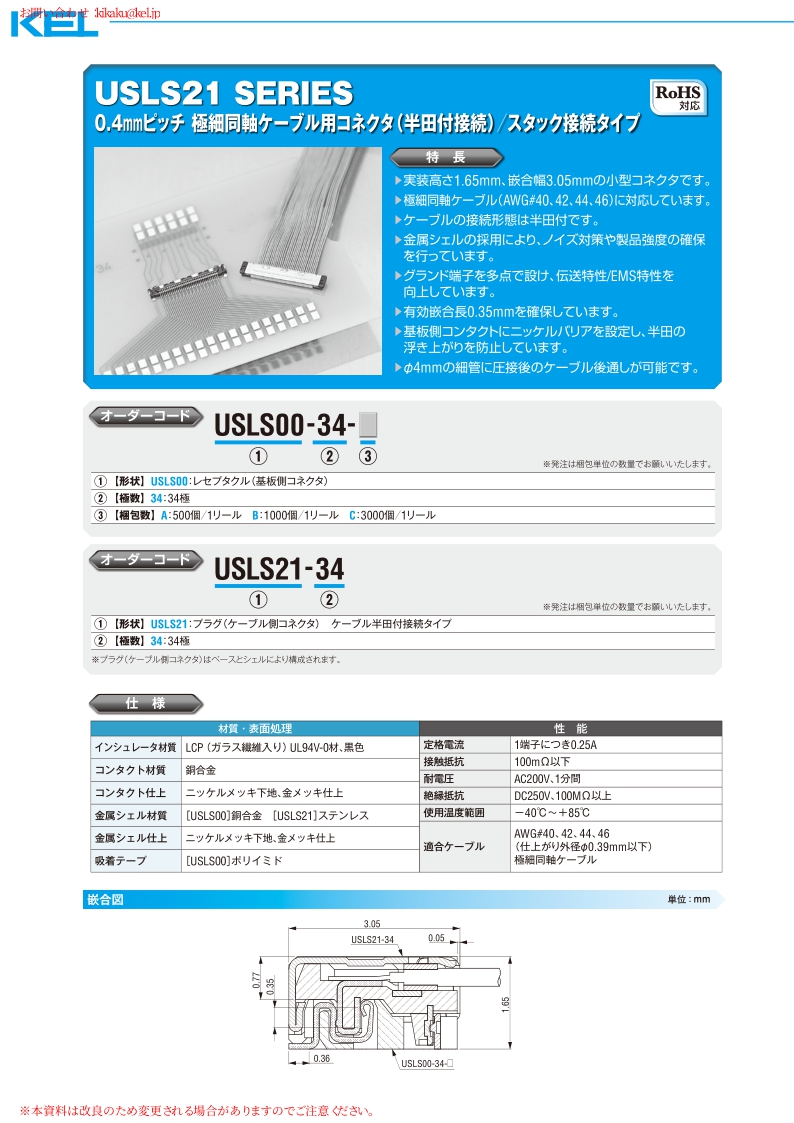 USLS21系列采用0.4mm間距設(shè)計(jì),電纜焊接,超細(xì)同軸電纜(AWG#40,42,44,46)型,堆疊連接型,插頭(電纜側(cè)連接器),34Pin。