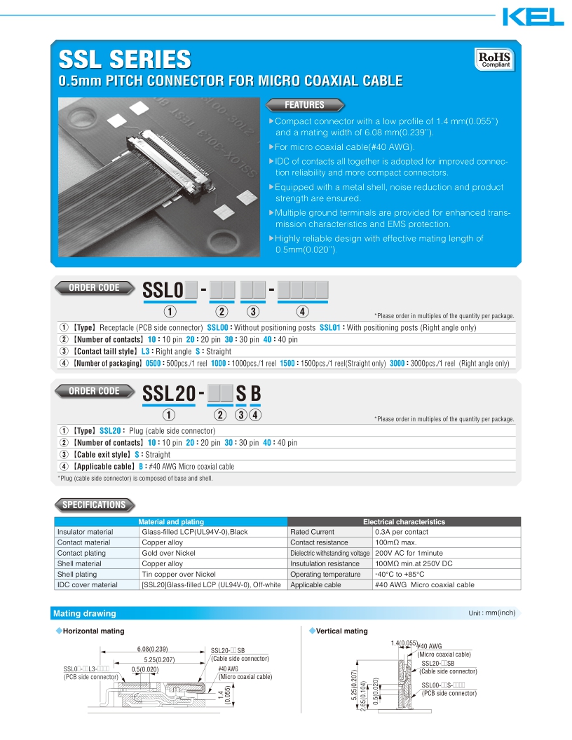 SSL系列采用0.5mm間距設(shè)計(jì),壓接連接器,超細(xì)同軸電纜(AWG#40)型,插頭(電纜側(cè)連接器),直型。